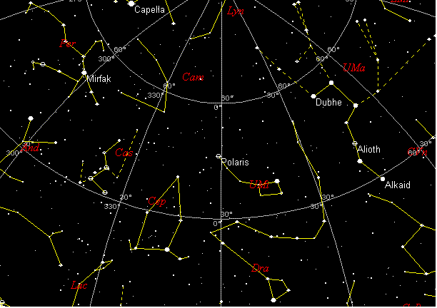 | In questa animazione appare il movimento delle costellazioni circumpolari nel periodo di sei ore: le due costellazioni più evidenti sono l'Orsa Maggiore nella zona in alto a destra, e Cassiopea (dalla caratteristica forma a W) in basso a sinistra. Al centro si trova la Stella Polare (costellazione dell'Orsa Minore), la quale rimane ferma poiché si trova quasi esattamente in corrispondenza del Polo Nord celeste. |