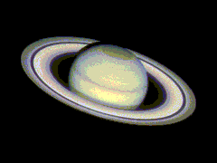 Saturno è il sesto pianeta in ordine di distanza dal Sole e il secondo per dimensioni.Saturno è formato da un involucro gassoso che avvolge un nucleo di idrogeno liquido: la sua atmosfera ha una struttura simile a quella gioviana, con un'alternanza di zone chiare e fasce scure disposte parallelamente all'equatore. Si riconoscono aree con perturbazioni di tipo ciclonico: i venti soffiano con velocità che all'equatore toccano i 1.800 km/h, mentre diminuiscono sino a scomparire nelle zone polari. Il pianeta ha un forte campo magnetico, i cui effetti si estendono nello spazio per oltre 1.200.000 km, ed emette una quantità di calore superiore a quella ricevuta dal Sole. Ma la struttura più rilevante di Saturno sono senza dubbio gli anelli che circondano il pianeta sul piano equatoriale. Osservati già da Galilei, ma riconosciuti come tali da Huygens, gli anelli sono formati da migliaia di corpuscoli (frammenti di ghiaccio e polveri) il cui diametro va da pochi micrometri al metro, ognuno in rotazione attorno a Saturno su una propria orbita; gli anelli, dunque, non sono un sistema rigido, né tanto meno compatto. Saturno è il centro di un sistema di diciassette satelliti. |